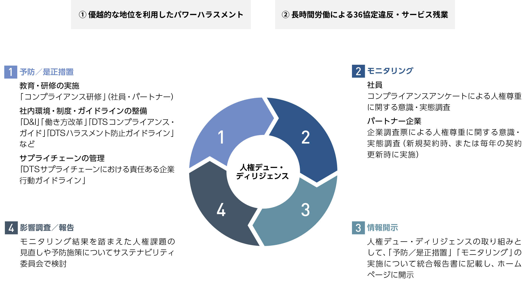 DTSグループでは、事業活動およびサプライチェーンにおける人権への負の影響を把握し、防止・軽減するとともに、課題が認められた場合は是正・救済につなげるため、人権デュー・ディリジェンスを継続的に実施しています。