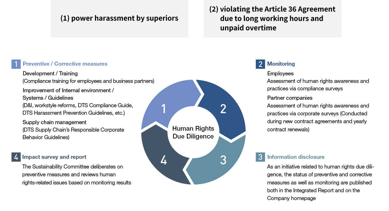 The DTS Group continuously conducts human rights due diligence to identify, prevent, and mitigate adverse impacts on human rights in its business activities and supply chain, and to ensure that, where issues are identified, they lead to corrective action and remedy. We have identified the following as human rights issues in the DTS Group and are promoting initiatives with an emphasis on preventing their occurrence and correcting them.